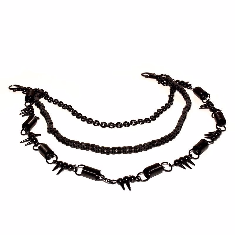 Musta metallinen lompakkoketju. Ketjun kummassakin päässä klipsilukko