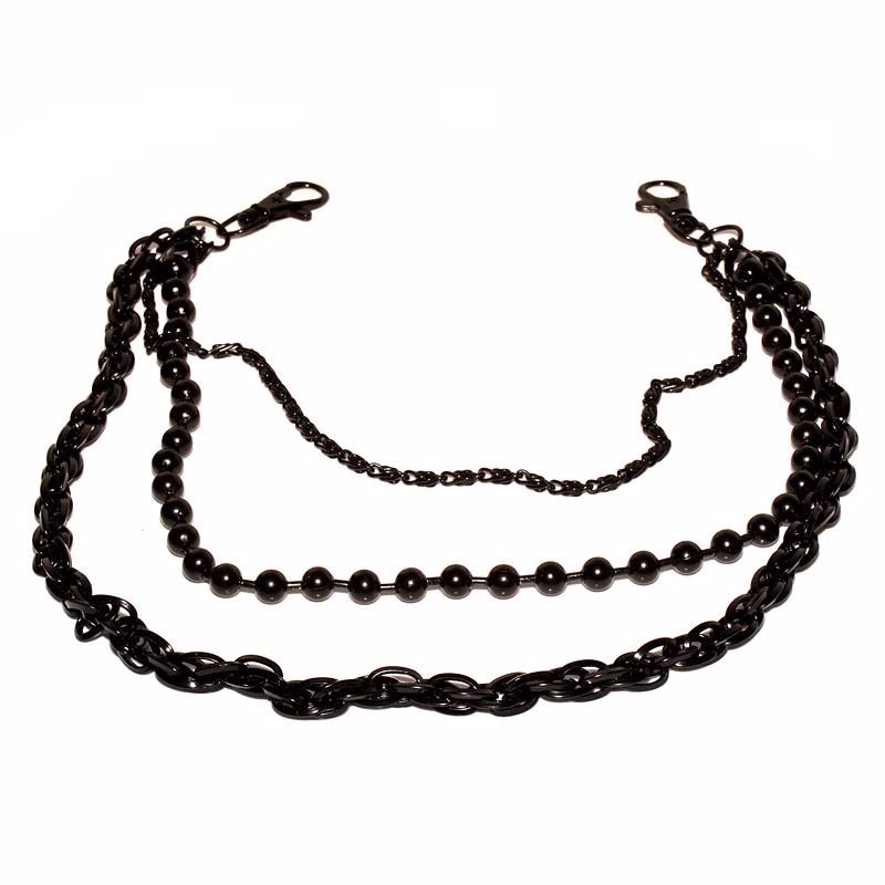 Musta metallinen lompakkoketju. Ketjun kummassakin päässä klipsilukko